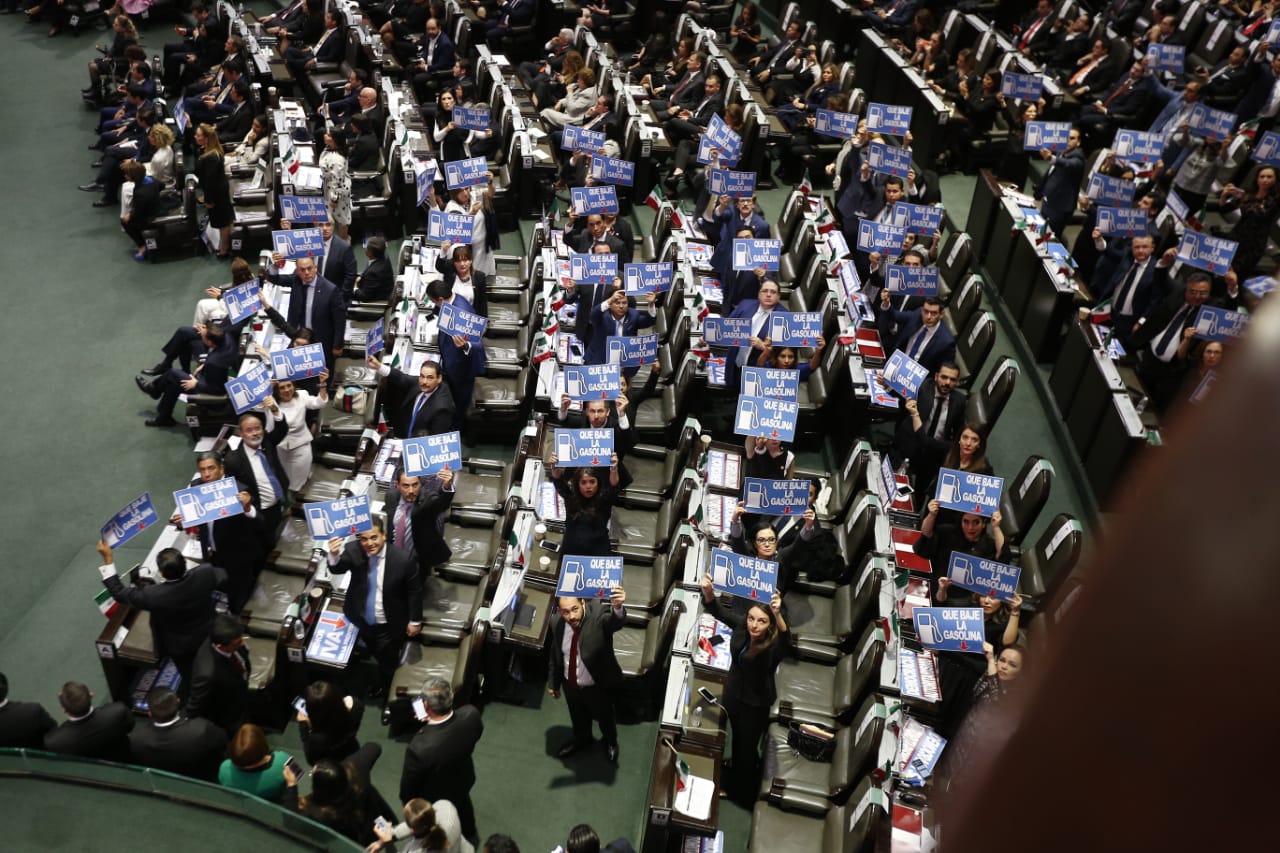 Legisladores del PRI y el PAN protestaron con pancartas azules, cuya leyenda decía “Que baje la gasolina”, mientras el Presidente explicaba parte de su estrategia económica.
