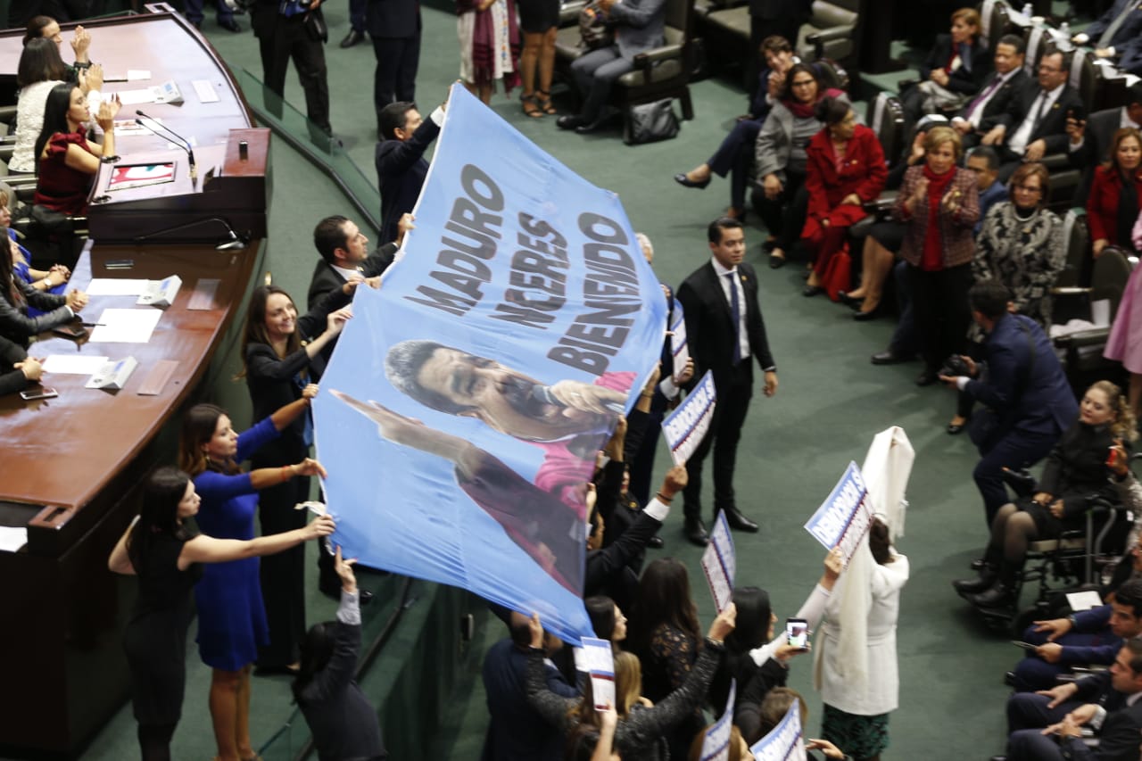 La primera manifestación fue de los legisladores del Partido Acción Nacional, quienes colocaron en las paredes del Salón de Sesiones una manta con el rostro del presidente de Venezuela, Nicolás Maduro. “Maduro no eres bienvenido” (sic).