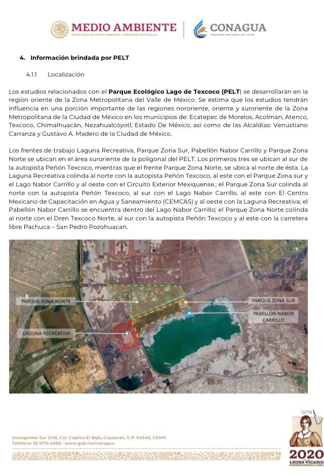 La Comisión Nacional del Agua (Conagua) lanzó las primeras tres licitaciones del Proyecto Ecológico del Lago de Texcoco (PELT) que consisten en la contratación de servicios para realizar tres estudios para identificar condiciones de vialidad, conectividad y accesibilidad, creación de estrategias para el desarrollo de espacios públicos, así como de tácticas para el manejo de paisajes como cuerpos de agua y vegetación, dentro del lago Nabor Carrillo, territorio donde se construiría el NAIM cancelado por el gobierno federal.