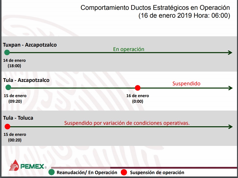 Sin embargo, explicó que sacaron de operación el ducto de Tula-Toluca, debido a que detectaron que ha sufrido varios daños y es susceptible a robos.