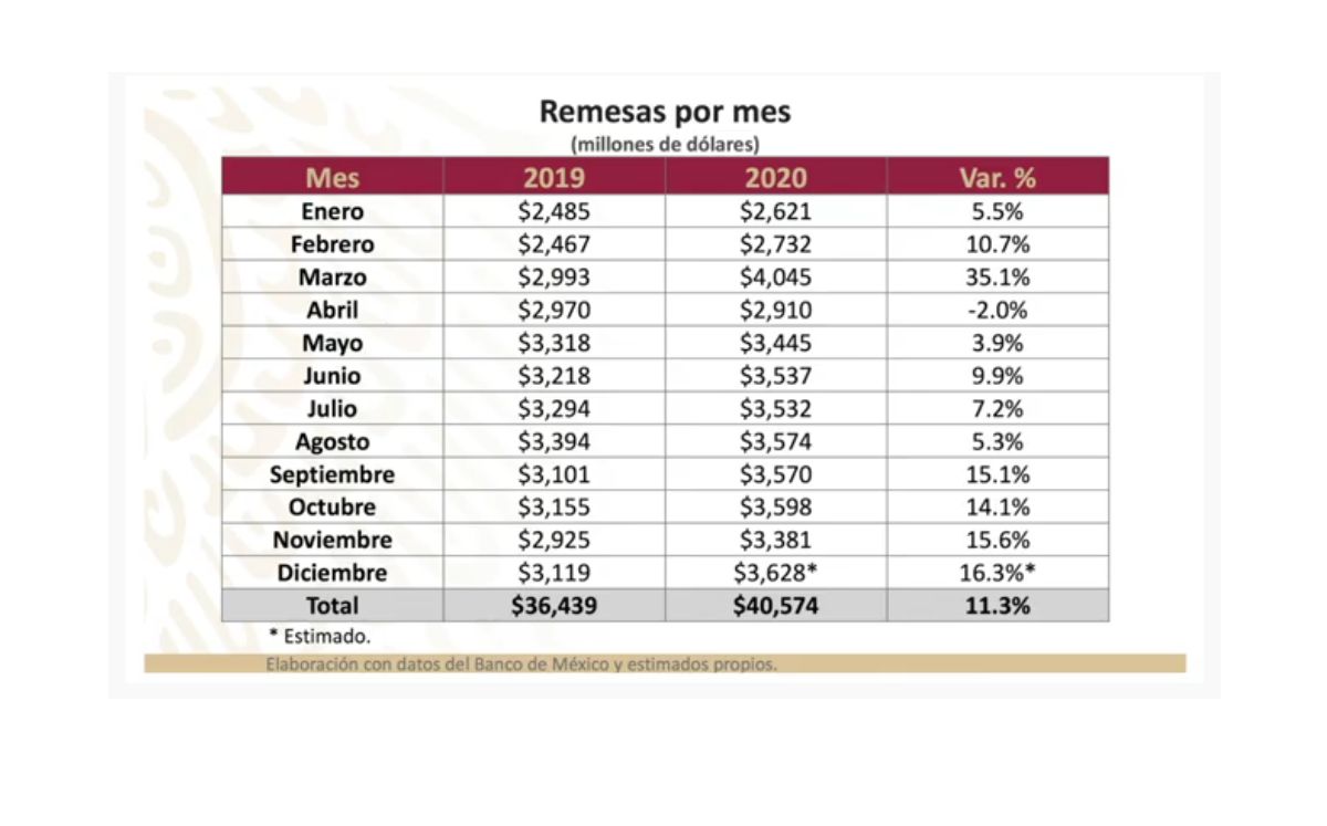 “En 2019 las remesas sumaron 36 mil 439 millones de dólares, mientras que en 2020, de acuerdo “a nuestra proyección de diciembre, que ya tenemos indicios, vamos a llegar a 40 mil 574 millones de dólares, ese es el estimado. Esto significa un incremento del 11.3 por ciento”, destacó.