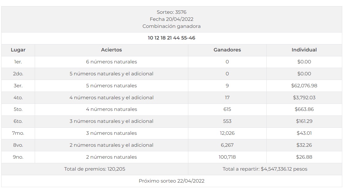 El premio del sorteo 3575 realizado este domingo fue de 4 millones 547 mil 336.12 pesos.