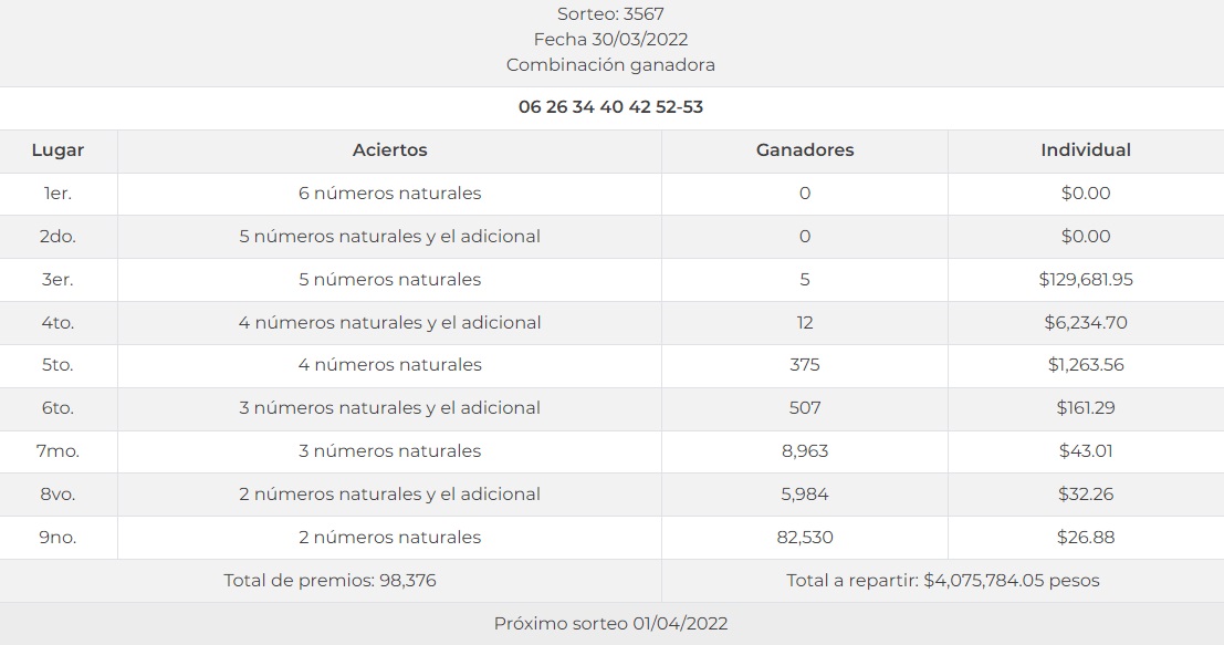En esta ocasión, el monto total a repartir entre los ganadores es de 4 millones 75 mil 784.05 pesos.