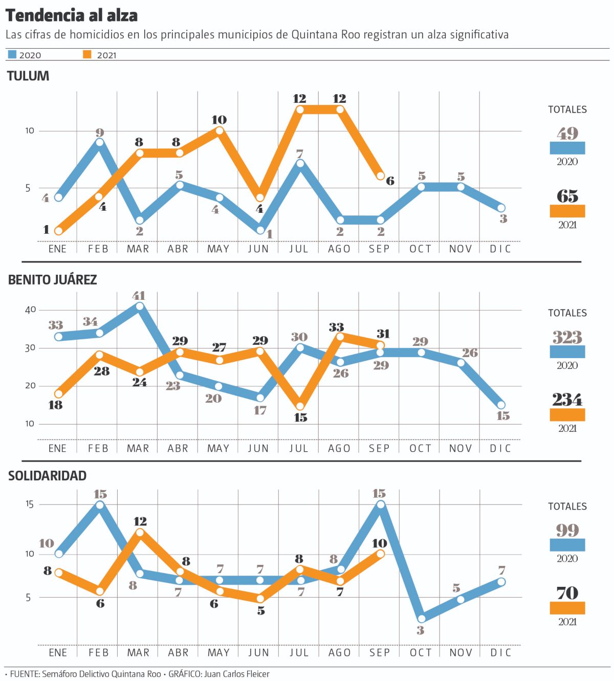 De acuerdo con estadísticas del Secretariado Ejecutivo del Sistema Nacional de Seguridad Pública, en Tulum, las carpetas de investigación por narcomenudeo se incrementaron más de mil 200 por ciento al pasar de tan sólo 6 en 2019 a 76 en 2021. Mientras los homicidios se duplicaron en un 52.3 por ciento en comparación con el 2019.