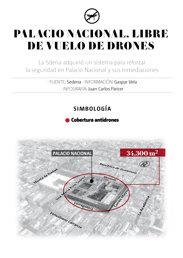 La Secretaría de la Defensa Nacional (Sedena) adquirió un sistema antidrones para crear una “No Fly Zone” (lugar libre de vuelo de drones), en Palacio Nacional y sus inmediaciones - 34 mil 300 metros cuadrados -, con el fin de evitar que se vulnere la seguridad y la privacidad del presidente Andrés Manuel López Obrador, mediante ataques, espionajes o hackeos.