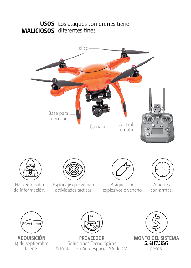 “Los usos de drones maliciosos pueden tener diferentes fines, entre ellos; ataques por medio de drones con material explosivo venenoso y ataques con drones adaptados con armas de fabricación casera. Realizar espionaje que pueda vulnerar la privacidad de actividades tácticas, así como ataques de hackeo o robo de información, por medio de equipo de recopilación electrónica atado a drones (IMSI cátcher furtivo casero) o equipo de robo de información IP”.