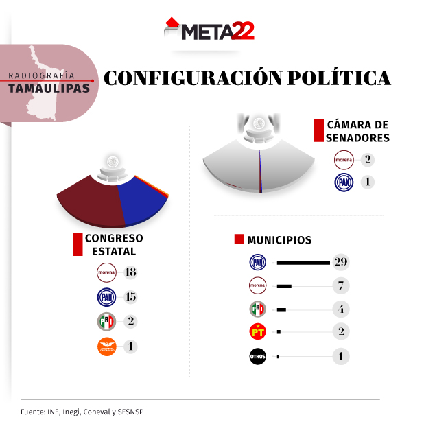 La 65 legislatura de Tamaulipas entró en funciones el 1 de octubre del año pasado y por primera vez la mayoría de los diputados son de un partido diferente de quien está al frente en el Poder Ejecutivo. Es Morena quien domina el Poder Legislativo, mientras que en alcaldías este mismo partido tiene pocas pero son algunas de las más pobladas y extensas en territorio: Reynosa, Nuevo Laredo, Matamoros, Ciudad Victoria, Ciudad Madero y Altamira.