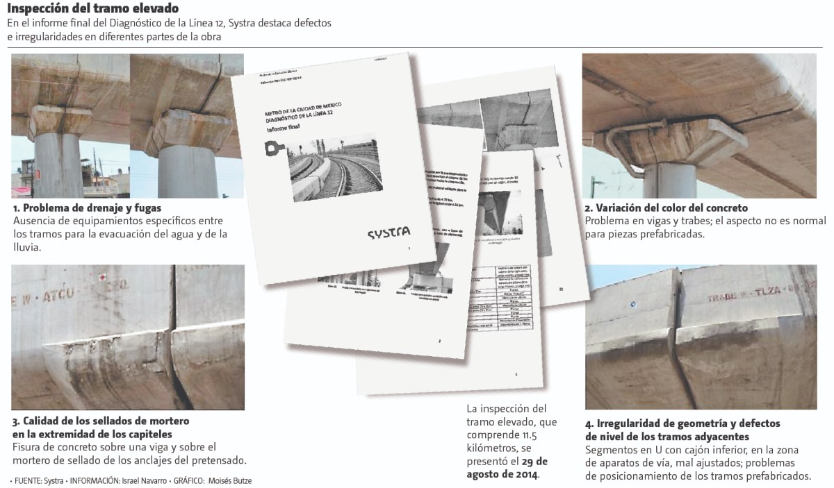 La empresa Systra, encargada de los diagnósticos de la Línea 12 del Metro, evidenció en 2014, un año antes de su reapertura en 2015 que el viaducto elevado, que comprende 10 estaciones, tenía fallas en sus obras como problemas de drenaje, fugas, variación en el color del concreto, fisuras, grietas, mala calidad en el sellado del mortero y hasta irregularidades de geometría y defectos de nivel.