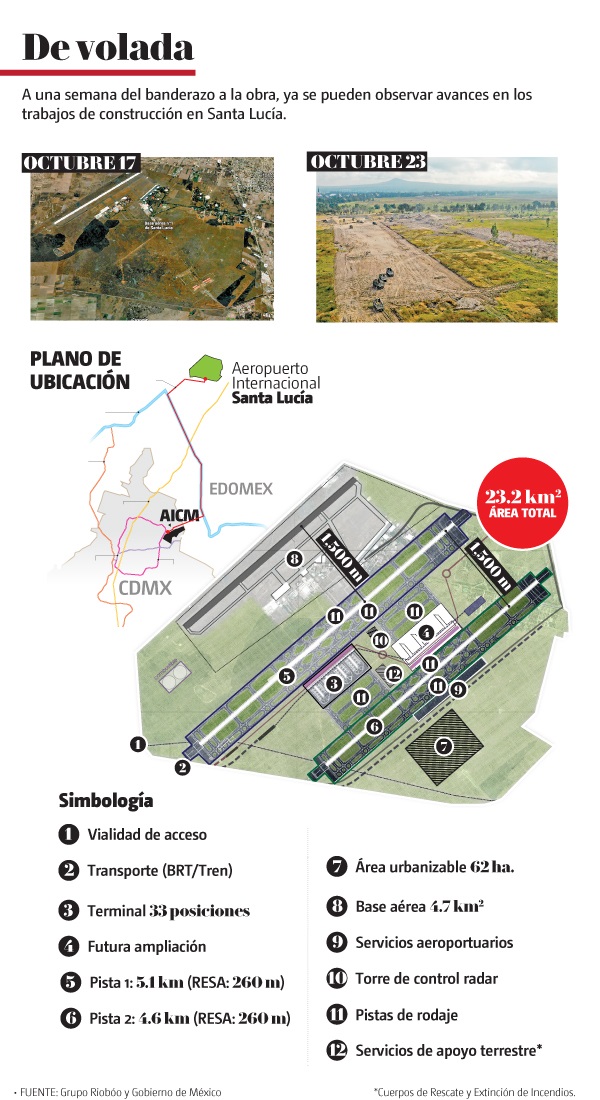En la zona ya se encuentra la maquinaria para cimentar la pista central, que será una de las tres (dos civiles y una militar ya existente) que darán servicio a 20 millones de pasajeros anuales en la etapa inicial, y a 85 millones en la final; las pistas permitirán aterrizajes y despegues de manera simultánea de vuelos nacionales e internacionales.