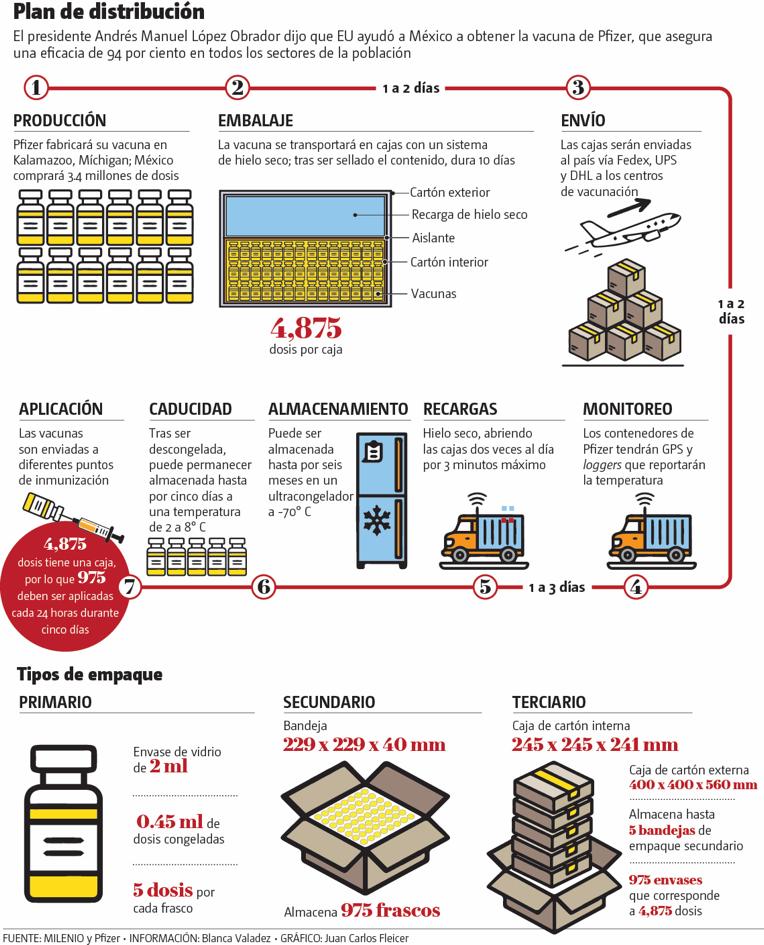 Las dosis de ARNm COVID-19 (BNT162b2) estarán empaquetadas en contenedores y la distribución será a través de avión, por Fedex, UPS y DHL (contratados por Pfizer) y la propuesta es que lleguen al Aeropuerto Internacional de Toluca, aunque no se descartan otras rutas como Ciudad de México y Querétaro.