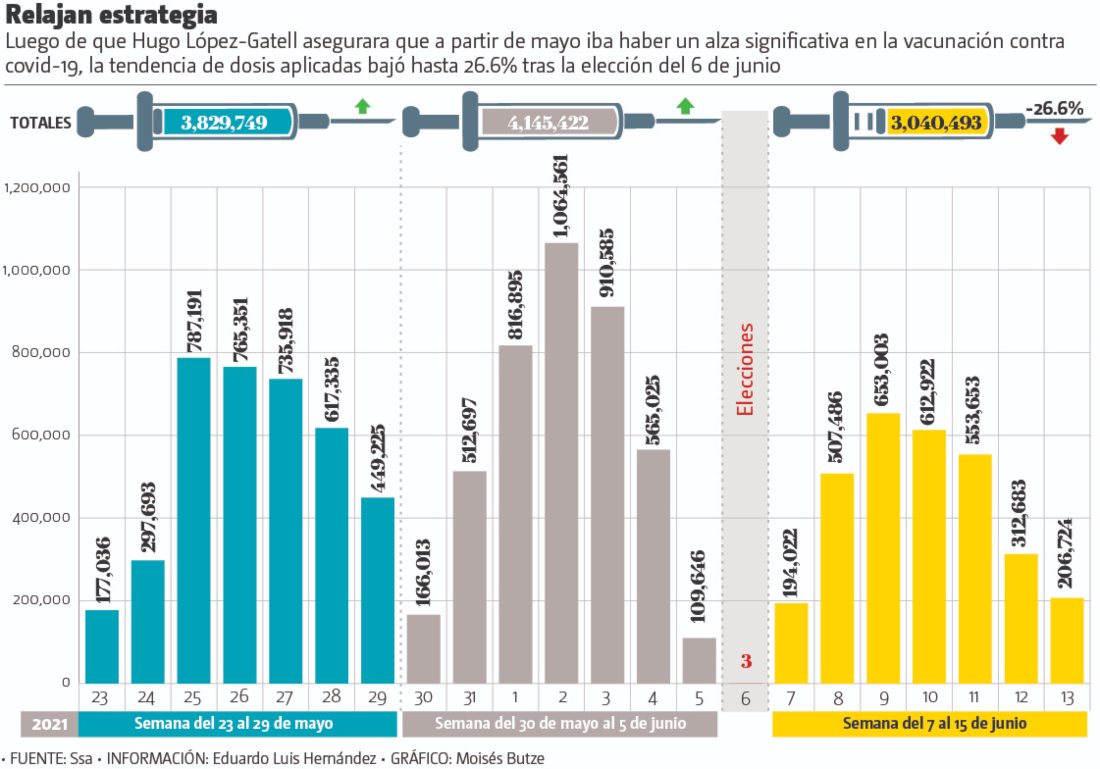 La velocidad de vacunación contra el covid-19 se redujo 26 por ciento la semana posterior a las elecciones respecto a la previa, según cifras de la Secretaría de Salud.