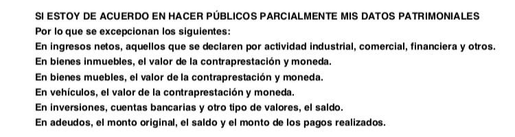 En el caso del vocero, su declaración indica que solicita excepcionar los rubros en “ingresos netos, aquellos que se declaren por actividad industrial, comercial, financiera y otros; en bienes inmuebles, el valor de la contraprestación y moneda; en bienes muebles, el valor de la contraprestación y moneda; en vehículos, el valor de la contraprestación y moneda; en inversiones, cuentas bancarias y otro tipo de valores, el saldo; en adeudos, el monto original, el saldo y el monto de los pagos realizados”.