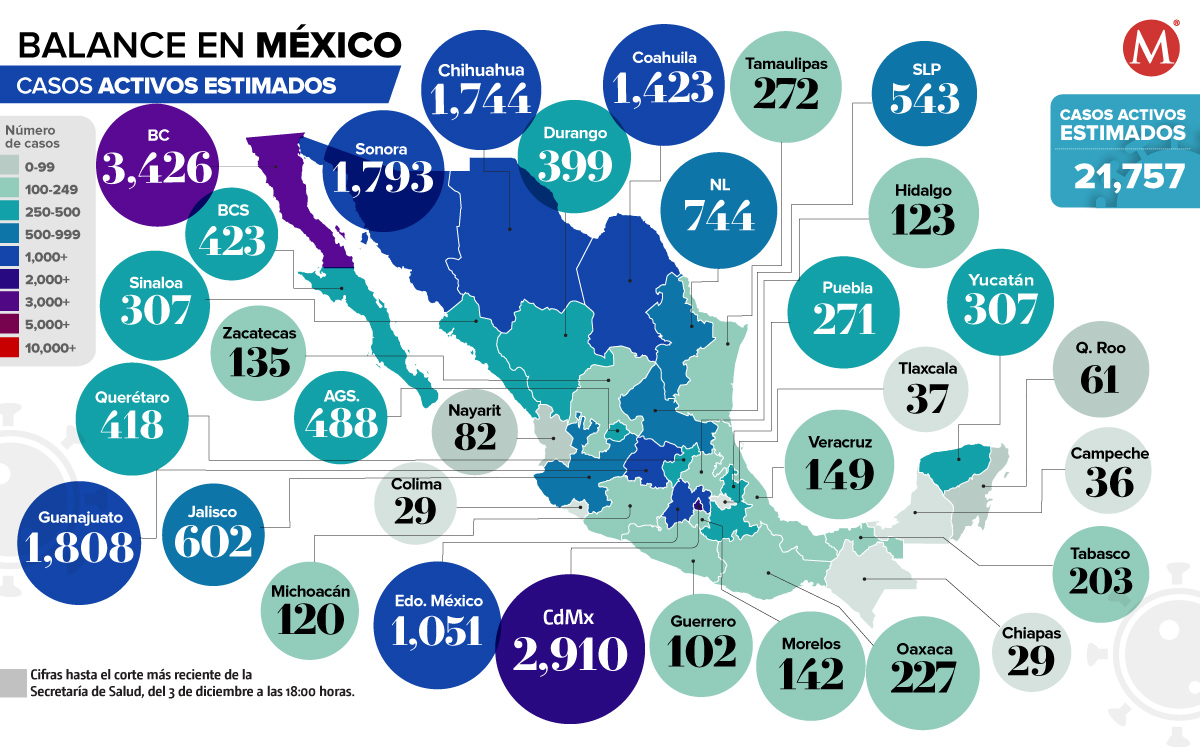 En Baja California hay 3 mil 429 contagios, Ciudad de México reporta 2 mil 910, Guanajuato estima mil 808, Sonora tiene mil 793, y en Chihuahua hay un aproximado de mil 744.