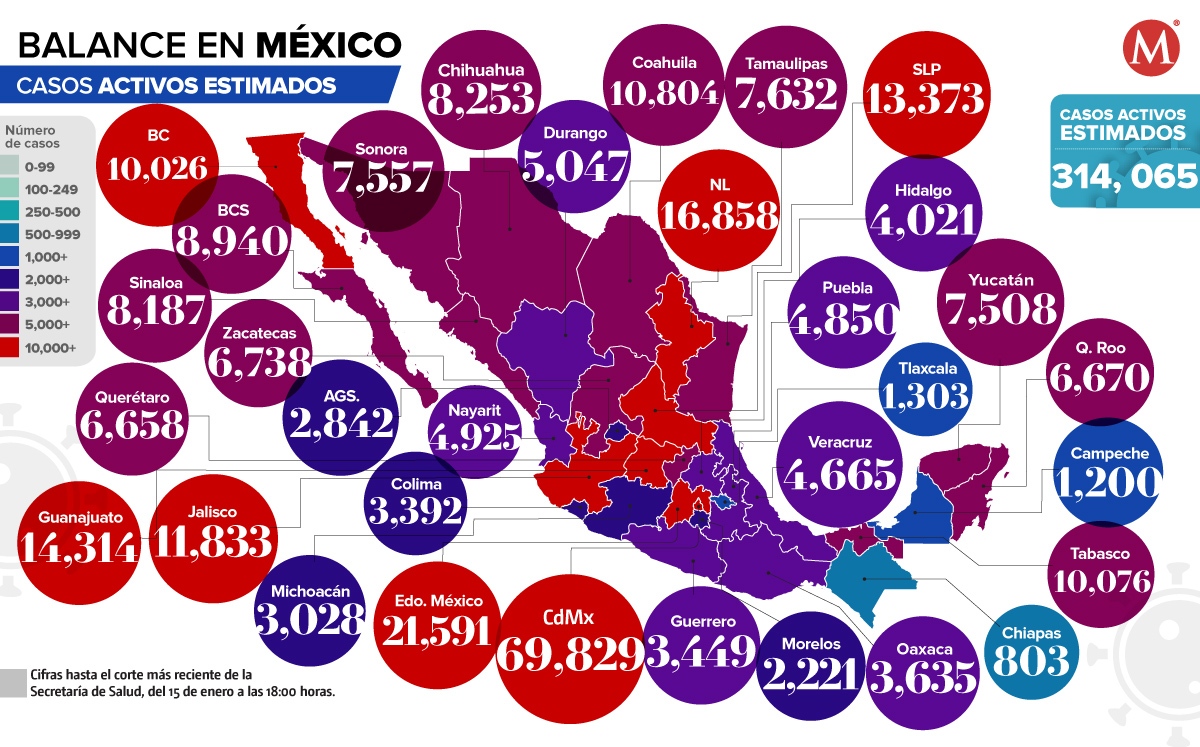 En Ciudad de México se estiman 69 mil 829 casos activos, Estado de México tiene 21 mil 591 contagios, Nuevo León contabiliza 16 mil 858, Guanajuato reporta 14 mil 314, y en San Luis Potosí hay 13 mil 373.