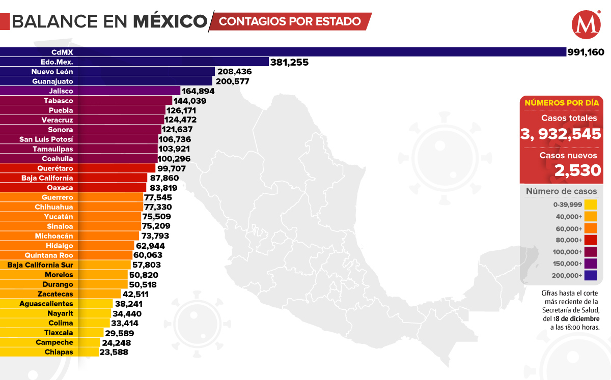 De acuerdo con la Secretaría de Salud, en México hay 3 millones 932 mil 545 casos acumulados de coronavirus, sumando 2 mil 530 contagios en las últimas 24 horas.