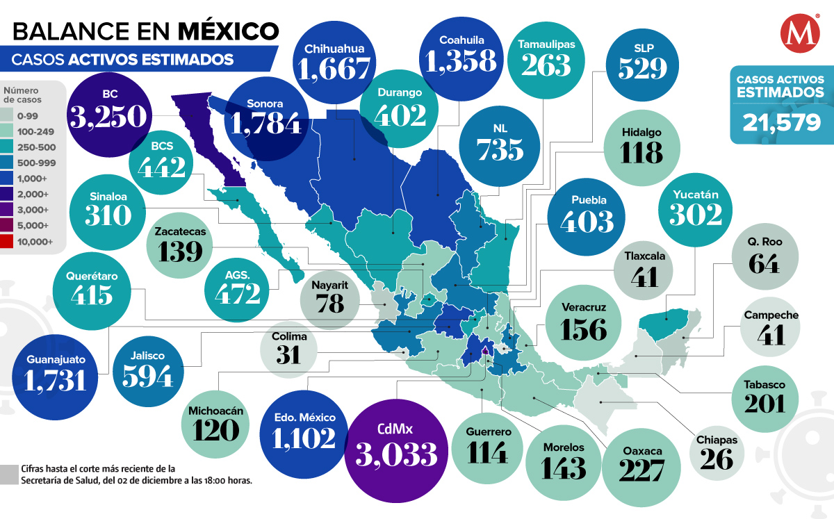 Los estados con menos casos activos son: Chiapas, con 26, Colima estima 31, Tlaxcala y Campeche tienen 41, y 64 en Quintana Roo.