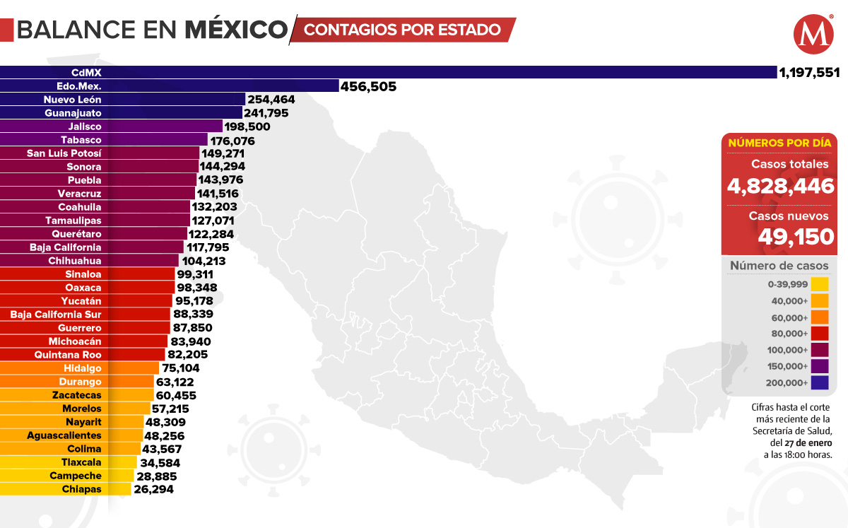 En México hay un acumulado de 4 millones 828 mil 446 casos de coronavirus, sumando 49 mil 150 contagios en las últimas 24 horas, de acuerdo con la Secretaría de Salud.