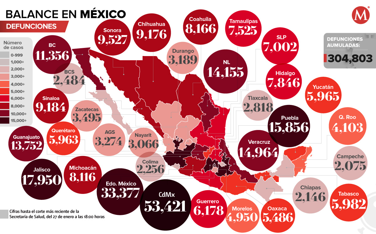 En Ciudad de México hay 53 mil 421 decesos acumulados, el Estado de México confirma 33 mil 377, Jalisco contabiliza 17 mil 950, Puebla registra 15 mil 856 y Veracruz tiene 14 mil 964.