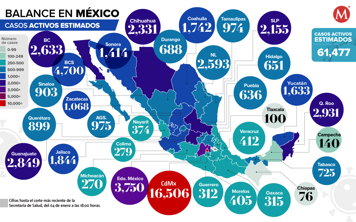 En Ciudad de México se estiman 16 mil 506 casos, Baja California Sur reporta 4 mil 700, Estado de México tiene 3 mil 750 contagios, Quintana Roo contabiliza 2 mil 931, y en Guanajuato hay 2 mil 849.
