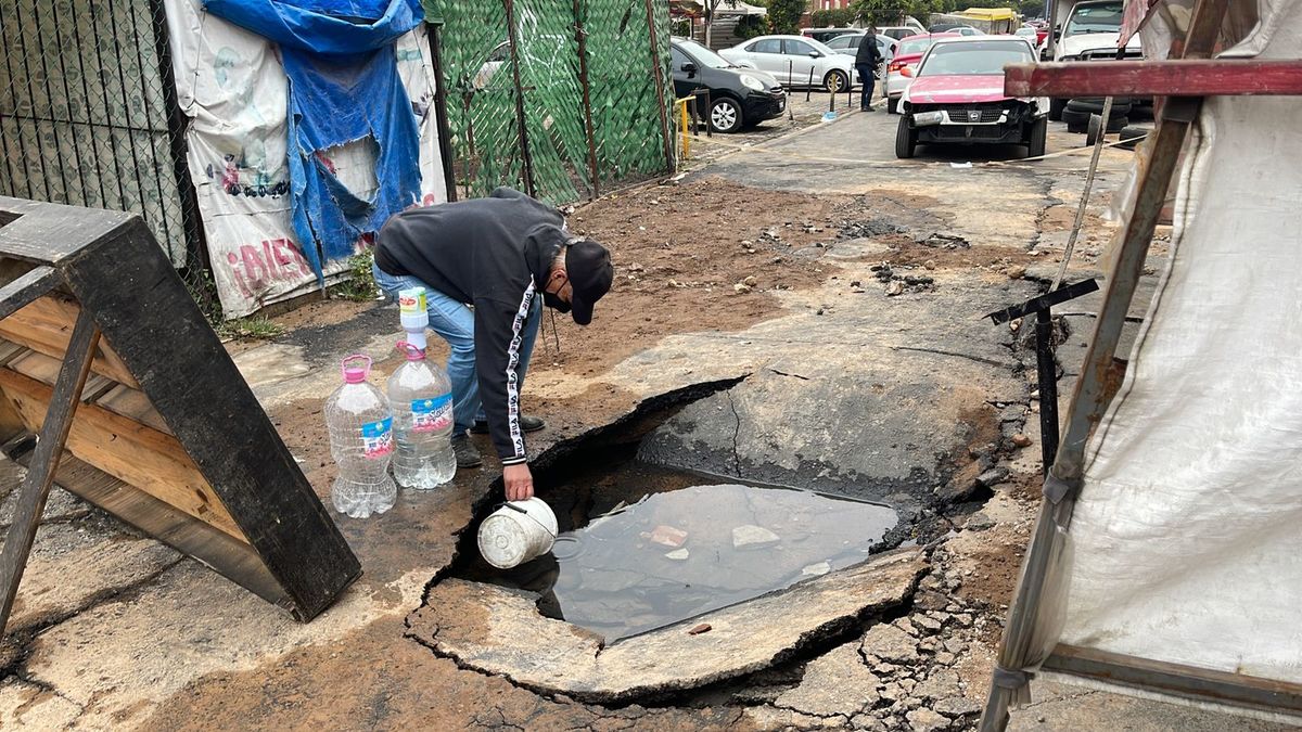 El hundimiento que se generó pasadas las nueve de la mañana del día de ayer domingo deja entrever la fuga de agua que aún no ha sido atendida por personal del Sistema de Aguas de la Ciudad de México ni por la propia alcaldía, por lo que los vecinos se han acercado al punto a recolectar un poco de agua al menos para utilizarla para el aseo del baño y de los pisos de sus departamentos.
