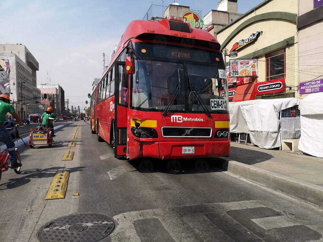 El vehículo involucrado es un Nissan March gris y la unidad CEM-612, placas 128-00-12 de la Línea 3, los cuales quedaron varados sobre los carriles del Metrobús con dirección a la estación Santa Cruz Atoyac.