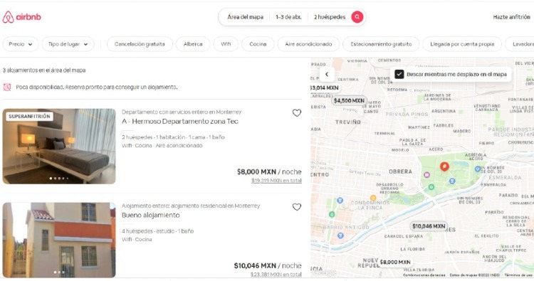 Los alojamientos más cercanos que quedan anunciados en la app están hasta en 24 mil pesos por noche, en la zona Sur, mientras que otros más económicos quedan un poco más retirados, por las colonias del Obispado.