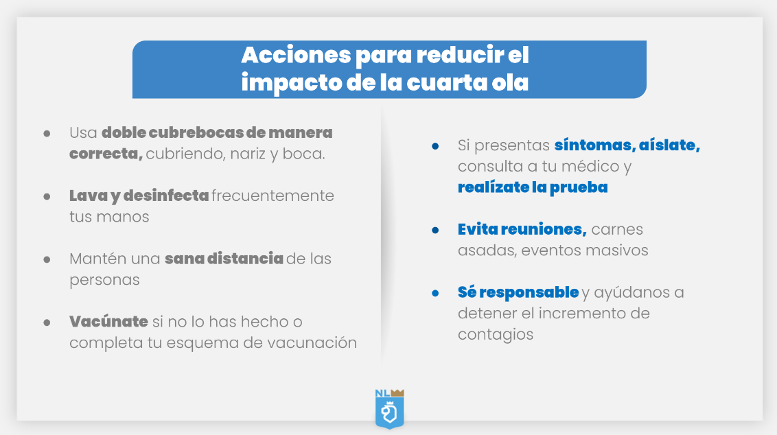 Dentro de las recomendaciones a seguir por la Secretaría de Salud para reducir el impacto de la cuarta ola de covid-19, está el uso de doble cubrebocas, evitar reuniones, carnes asadas y eventos masivos.