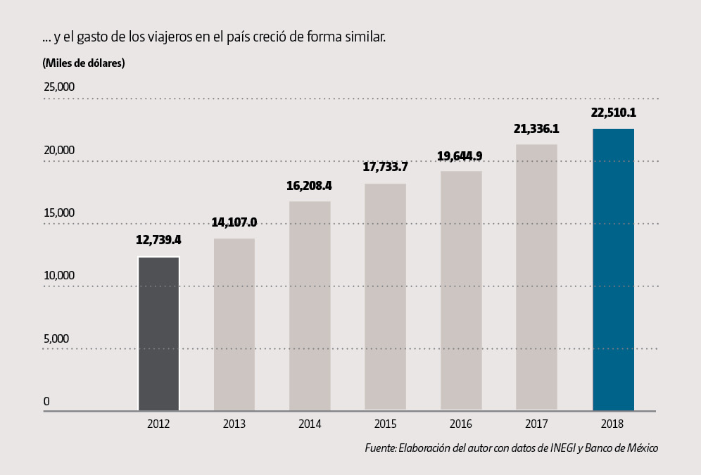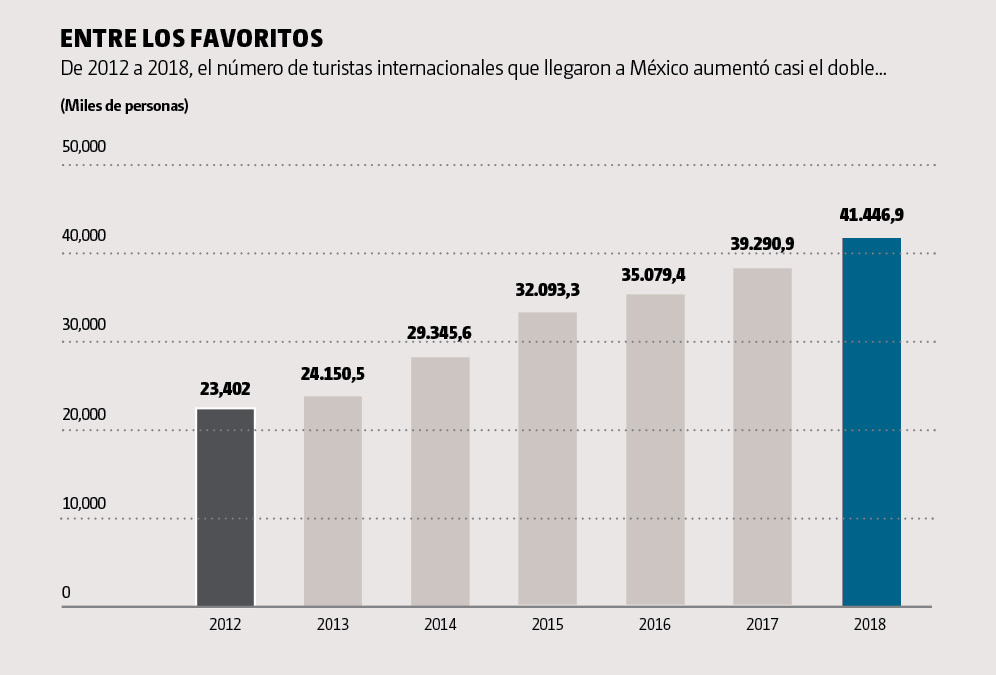 Es difícil imaginar un tiempo de mayor bonanza para el turismo mexicano que el que se vivió en el periodo 2012-2017. Los astros se alinearon y luego de la triple crisis que padeció el país al final de la primera década de este siglo —inseguridad, influenza y una recesión económica—, la mayor parte de las variables mostraron un inusitado crecimiento. Las llegadas de turistas internacionales y los ingresos que aportaron al país crecieron a un ritmo superior a 10%. De esta manera, México pasó del sitio 15 en el ranking mundial de turistas (2012) a un histórico sexto peldaño en 2017. Entre las razones que explican el crecimiento, destacan la recuperación económica de Estados Unidos (EU), la perseverancia de los empresarios, un mejor mensaje a los medios internacionales en cuanto al tema de seguridad —lo que no quiere decir que el problema de fondo se haya resuelto— y un consistente esfuerzo en materia promocional.