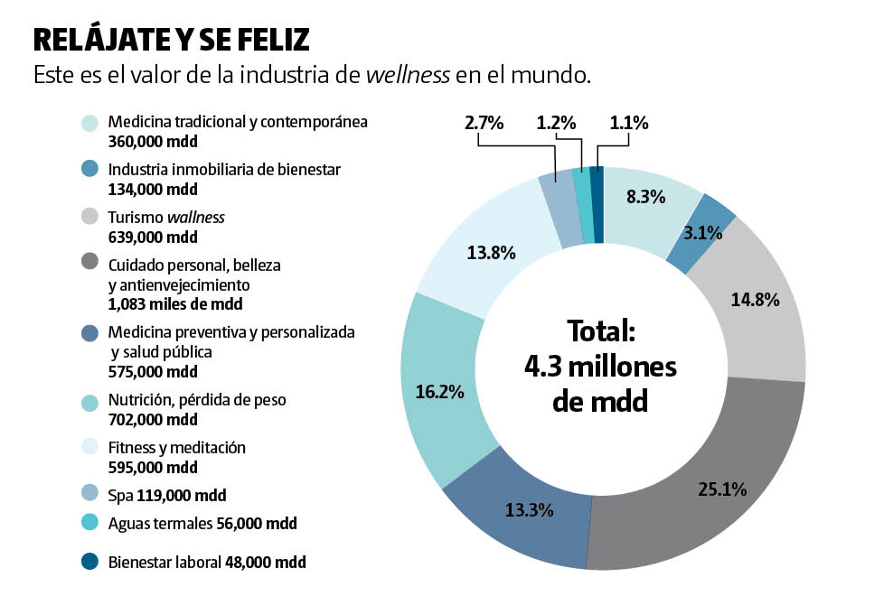 Esta nueva forma de viajar, que apuesta por una vida saludable y relajante, representa un mercado global de 639,000 mdd, según datos de 2017 del Instituto global del Turismo de Bienestar (GWI, por sus siglas en inglés). Esperan que para 2022 esa cifra alcance los 919,000 mdd. En su informe Global Wellness Tourism Economy, estiman que el turismo de bienestar crecerá a una tasa promedio anual de 7.5% hasta 2022, comparado con el 6.4% que pronostican para el turismo en general.