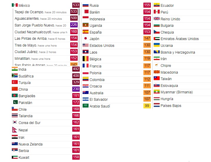 Sin embargo, a las 17:00 horas, México ya se ubicaba en el primer sitio, superando a India, Sudáfrica, Turquía y China. Sin embargo, cabe mencionar que en gran medida, México se ubicaba en ese sitio principalmente debido a la calidad del aire en Tepeji de Ocampo, en Hidalgo, y Aguascalientes.