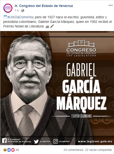 Sin embargo, el Congreso de Veracruz confundió el nombre del colombiano, al que llamó en Facebook "Francisco García Márquez". Aunque el post ya fue eliminado de la red social, varios usuarios hicieron captura de pantalla del error.