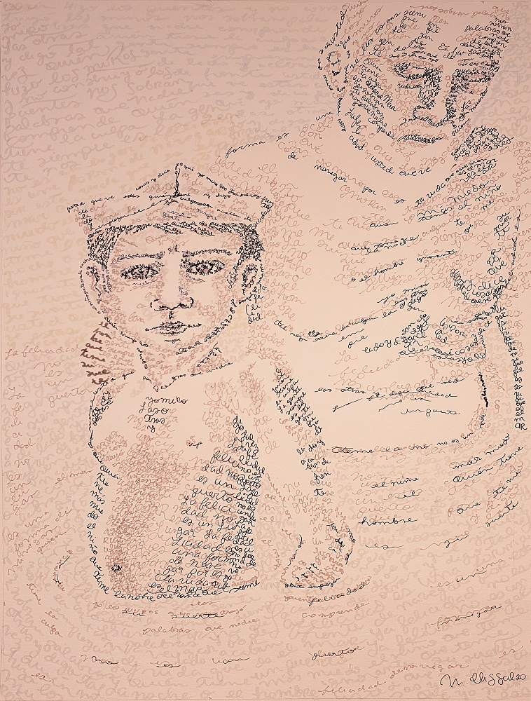 El Caligrama es una forma estética, poética, Elisa profundiza: “Es una imagen formada por palabras, por texto. Y acerca de lo que dices de no tener dogmas en tu vida y de dejar la creación abierta. Cuando escuché la canción, me imaginé una lluvia de palabras. Luego pensé que estamos hablando de navegar en el mar, tiene que haber palabras que formen el mar, y de ahí surjan los personajes de la canción, el viejo y el niño. Me gustó contrastar la anatomía del viejo y el niño, y poner un barco simbólico, un barco de papel en el sombrero del niño. Creo que, cuando se lee la canción y se desea interpretar, hay que ver más allá del texto. Ver también la fonética, el ritmo y todo lo que hace sentir”.