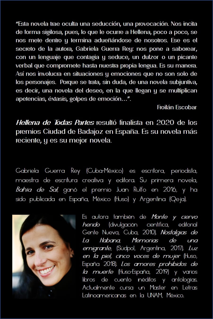 “Hellena de Todas Partes, fue una de las novelas finalista en 2020 de los premios ciudad de Badajoz, en España, y según Galano, quien ilustró la portada del libro, se trata de una obra que “en su enorme calidad humana, carece de un antagonista y aborda los desafíos de “seres humanos que se enfrentan a sí mismos, a sus circunstancias y destino”.