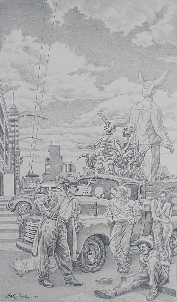 Héctor Morales ha cultivado la técnica del grabado llamada buril. En su dibujo plasma los personajes que describe la canción, nos dice: “El modo de hablar en México nos remite a historia, música, espacios, gente, situaciones, todo eso lo marca la canción, y lo consideré como un escenario. El dibujo sucede en una calle emblemática del Centro Histórico, Eje Central, y una vista desde Garibaldi. Está el Teatro Blanquita, los mariachis, la Torre Latinoamericana, el Centro Histórico. Los personajes más interesantes son pachucos, cholos y chundos, en una carrocería de un coche. Es una camioneta Chevy del 52. Hay unos diablitos y unas calacas de cartón que representan un tipo de identidad mexicana. El diablo, muy mexicano, malicioso y pachanguero. Las calaveras, que representan no sólo el Día de Muertos, sino lo que representa la muerte para el mexicano”.