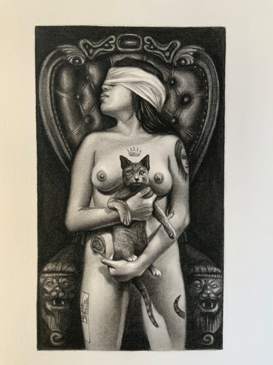El rey de José Alfredo no tiene nada, no tiene reina, reino, dinero, pero es el rey, de su voluntad, es un rey de la rebeldía, la canción-declaración ególatra, y la interpretación de Omar es rebelde, antiliteral, “Al escuchar la canción, veía tintes un poco machistas o de ego de ese personaje de “yo me siento grande, a pesar de no tener nada, de no ser nadie, pero sé que me vas a llorar cuando me vaya””. Él se gobierna solo, por así decirlo. Entonces Omar dibuja un gato, es el rey “precisamente, creo que la figura de los gatos, o de cualquier felino, siempre ha sido para mí de las más respetadas, por su temperamento, por su forma de ser. A un gato no lo tratas igual que a un perro, el gato hace lo que quiere, incluso un gato que vive en la calle es el rey, anda libre donde quiera; se sale de su casa; vuelve. Entonces por eso lo utilicé, con este trono, con los leoncitos de atrás ahí abajo, pretendiendo ser el rey de todo”.