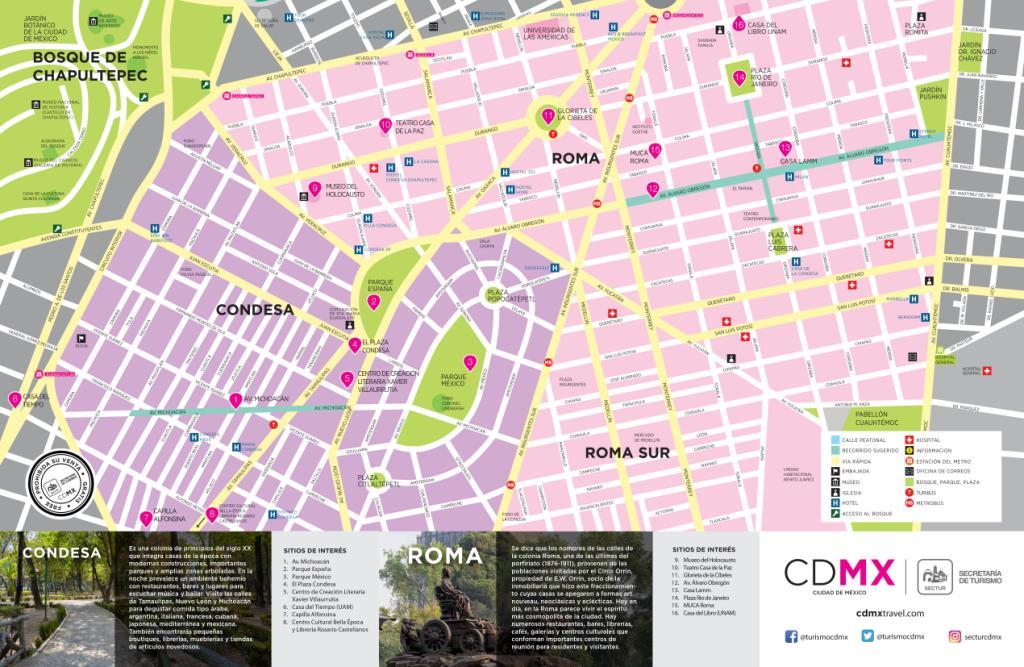 Mientras que en la colonia Roma está el Museo del Holocausto, la Glorieta de la Cibeles, el MUCA Roma, la plaza Río de San Janeiro, Casa Lamm, entre otras. En total, este mapa turístico recomienda visitar 16 lugares en ambas colonias.