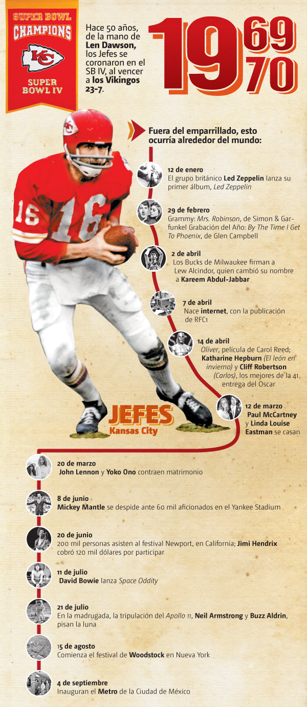 Hace 50 años, de la mano de Len Dawson, los Kansas City Chiefs se coronaron en el Super Bowl IV al vencer 23-7 a los Minnesota Vikings.