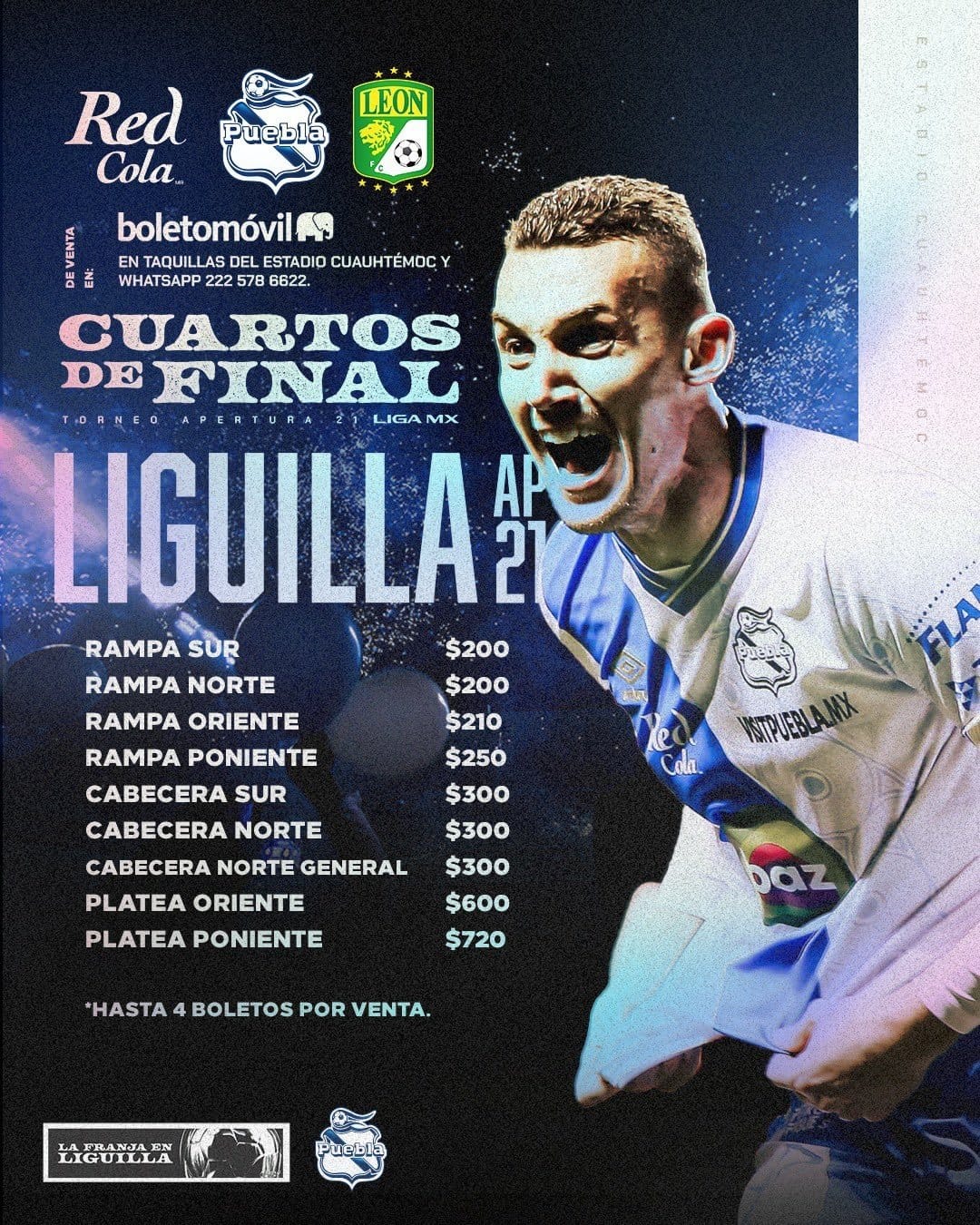 Tras confirmarse los días y horarios de juego, la directiva del Club Puebla puso en marcha la venta de boletos para el duelo de ida de los Cuartos de Final, donde el cuadro Camotero se verá las caras, un año después, con los Panzas Verdes del León en la cancha del estadio Cuauhtémoc el próximo jueves en punto de las 19:00 horas.