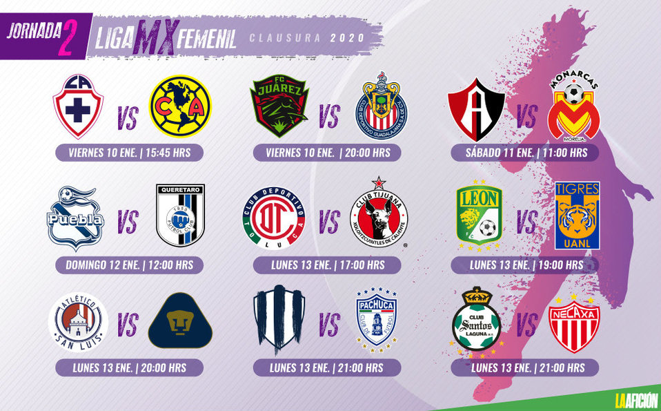 La jornada 2 del Clausura 2020 de la Liga MX Femenil iniciará este viernes 10 de enero de 2020 y nos traerá grandes duelos,