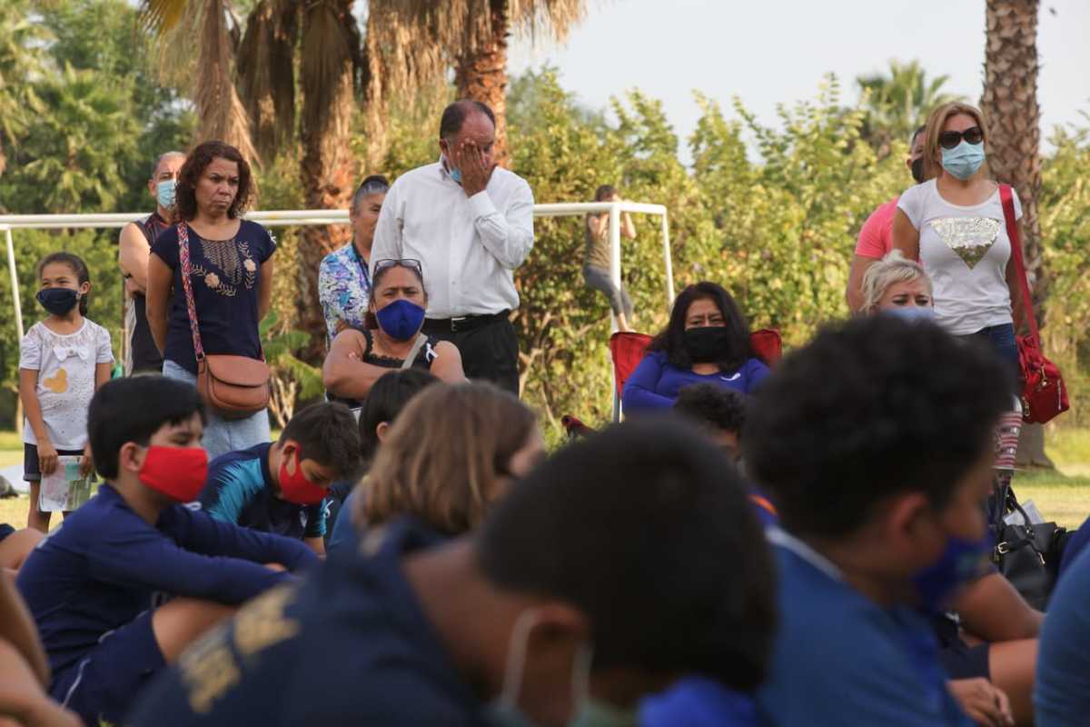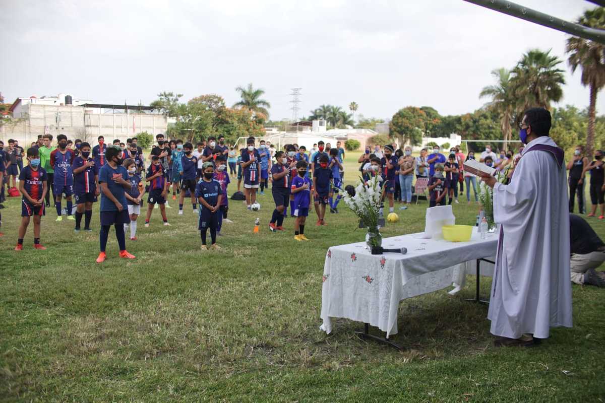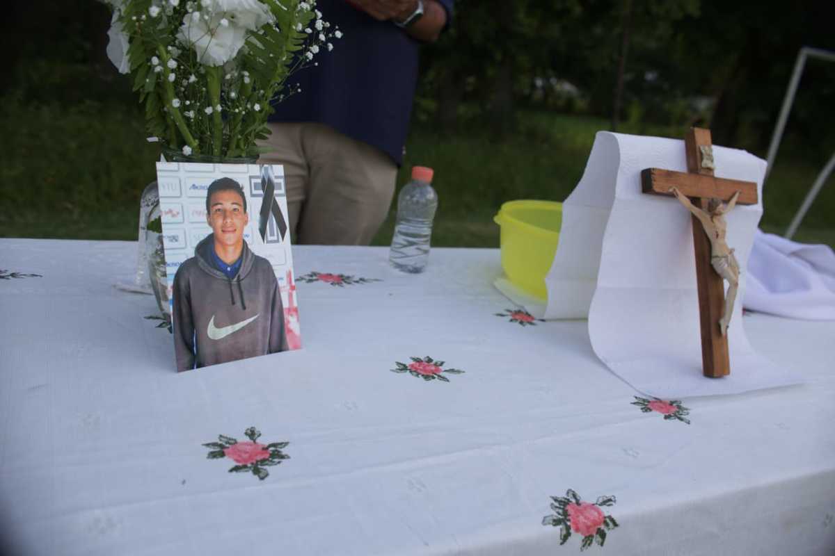 “Queremos pedir a Dios por Diego Miranda que ha terminado su peregrinar por este mundo”, expresó el padre frente al equipo y los padres de familia, detrás de un altar con la foto del joven jugador y debajo de la portería.