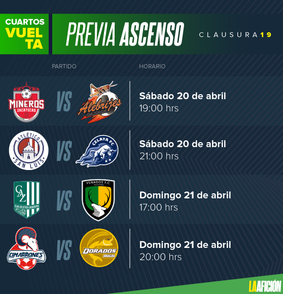 Para el sábado 20 de abril, Mineros - en el Estadio Carlos Vega Villalba- tratará de revertir el 1-0 en contra que sufrió en la ida en ante Alebrijes; el equipos de Zacatecas sabe que un gol de los de Oaxaca, en consecuencia, los obligaría a hacer tres tantos.