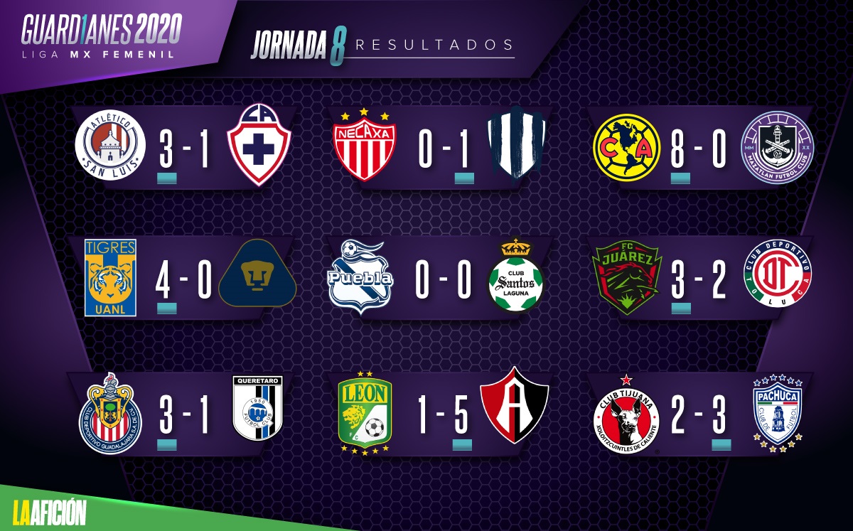 Culminó la octava jornada del Guardianes 2020 en la Liga MX Femenil donde las Rayadas de Monterrey se mantienen en la cima de la clasificación con 24 unidades luego de vencer por la mínima a Necaxa.