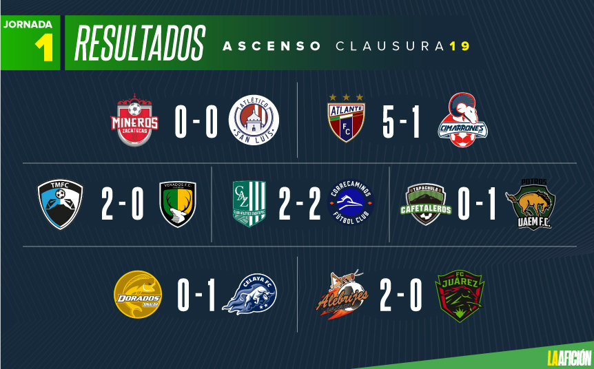 Atlante lidera la tabla general en el Ascenso MX tras el paso de la Jornada 1 del Clausura 2019 tras golear 5-1 a Cimarrones de Sonora en el Estadio Andrés Quintana Roo.