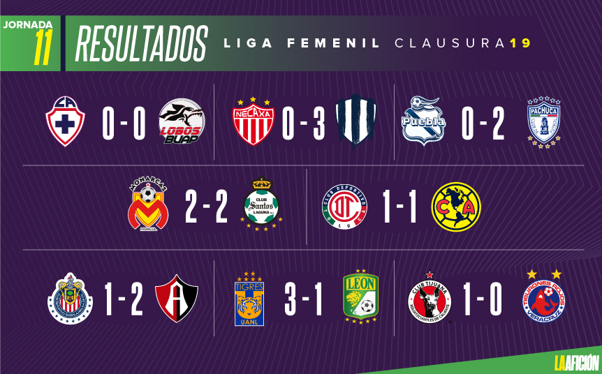 Terminó la undécima jornada de actividades del Clausura 2019 en la Liga MX Femenil, fecha en la que Pachuca y Tigres mantuvieron el liderato de sus respectivos grupos.