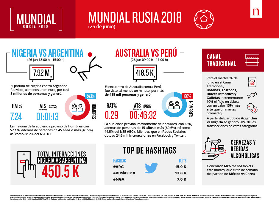 De acuerdo a los datos de Nielsen del 18 al 24 de junio, así como la infografía con datos de las transmisiones del martes 26 de junio, el partido de Nigeria vs Argentina fue visto al menos por casi 8 millones de personas por un minuto. De esta cantidad, el 57.1% fueron hombres, mientras el 40.5% se trataron de personas de 45 años o más.Por su parte, el encuentro de Australia vs Perú fue visto al menos un minuto por más de 418 mil personas.