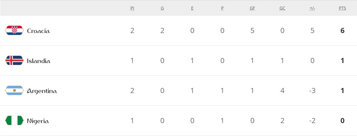 Ante esto, los balcánicos finalizarían con siete o nueve unidades; Argentina con cuatro; Nigeria con tres e Islandia con dos o una, dependiendo de que éstos no ganen.