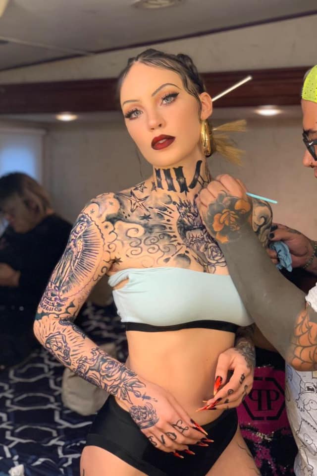 De la grabación del video, en Facebook circularon otras imágenes, en las que se aprecia a Belinda durante el proceso para tatuarle todo el cuerpo.