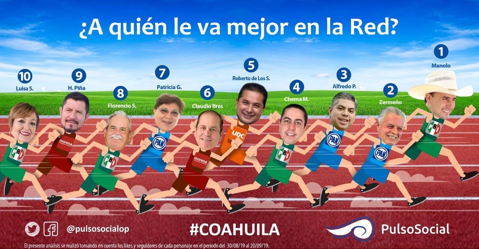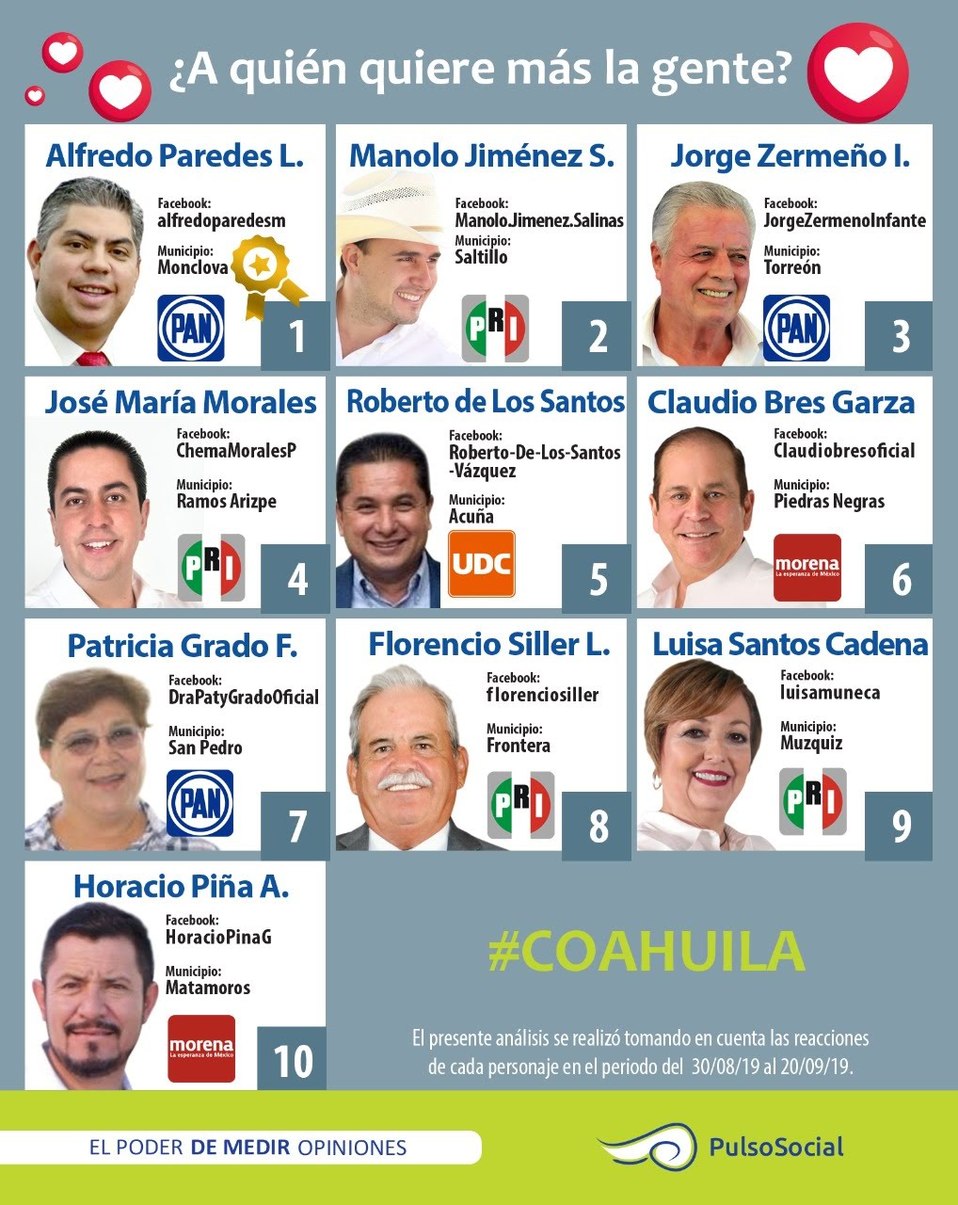 El ranking de la consultora Pulso Social sobre los 10 alcaldes coahuilenses que cuentan con mayor presencia en las redes sociales ubica a los ediles de Manolo Jiménez de Saltillo, Jorge Zermeño de Torreón y Alfredo Paredes de Monclova, en las primeras posiciones.