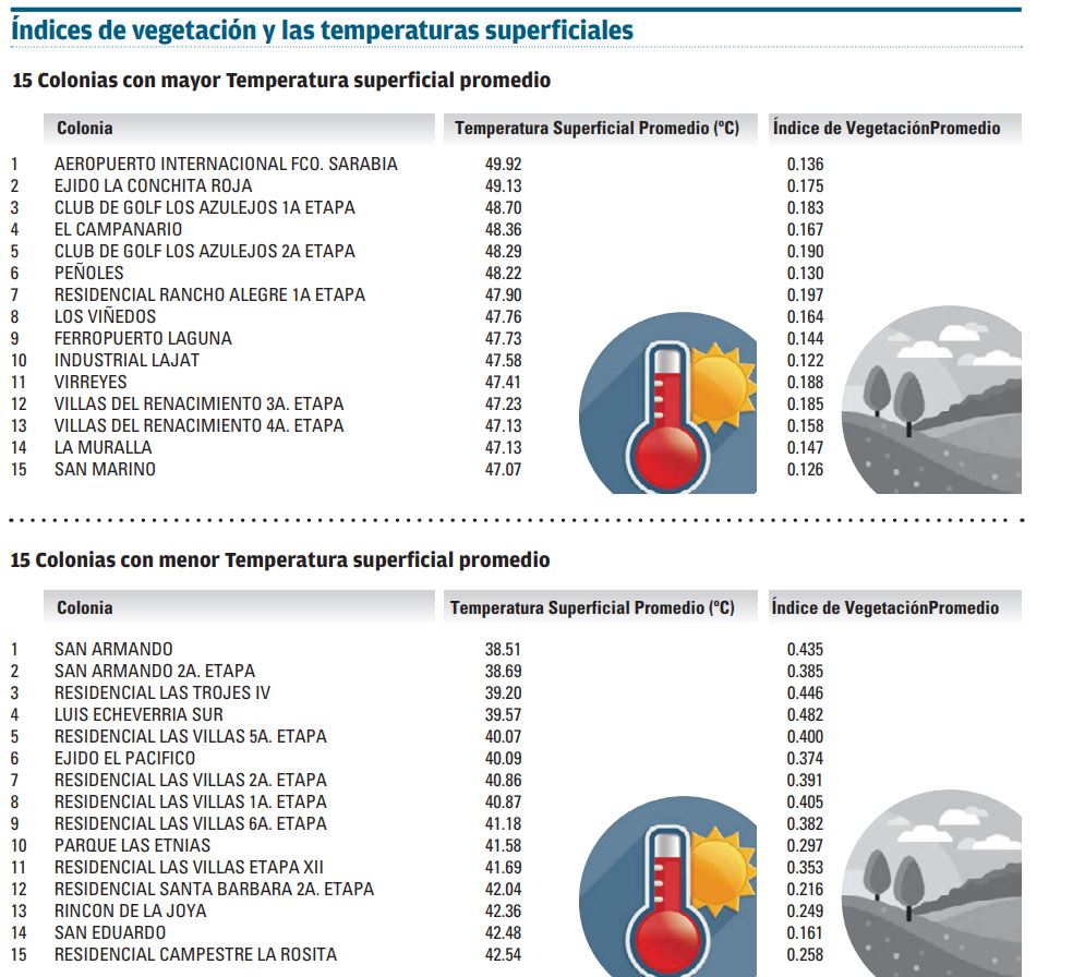 Mientras que las colonias con mayores temperaturas superficiales fueron aquellas con un índice de vegetación menor, estando dentro de esta lista: el Aeropuerto Internacional Francisco Sarabia Tinoco, Ejido la Conchita Roja, Club de Golf Los Azulejos y El Campanario, entre otros.