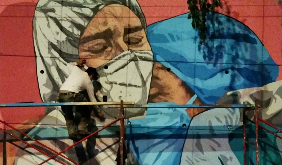 David de León -como se hace llamar- en colaboración con otros seis artistas plásticos trabajaron durante 5 noches, con un horario de las 9 de la noche a las 8 de la mañana del siguiente día, para dar un mensaje del esfuerzo que están realizando médicos y enfermeras a nivel global.